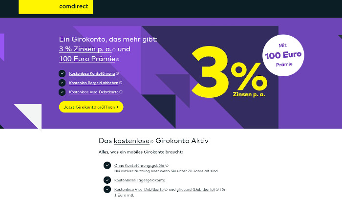 Ab sofort bietet die Comdirect auch das Kontomodell Girokonto Extra für 2,90 Euro pro Monat an. Kunden erhalten neben der Visa Debitcard auch eine kostenlose Visa Kreditkarte zum Konto und können damit ohne Kosten im Ausland bezahlen.