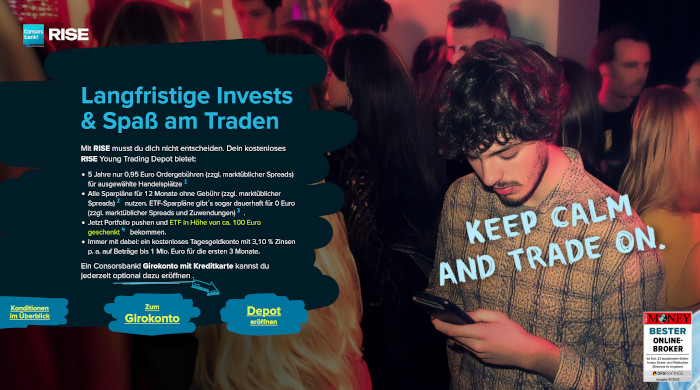 Das neue RISE Young Trading Depot richtet sich an junge Kunden zwischen 18 und 30 Jahren. Sie können mit dem Depot in Wertpapiere investieren oder Schritt für Schritt mit Sparplänen starten. Neukunden profitieren 5 Jahre lang von niedrigen Ordergebühren und zahlen 1 Jahr lang keine Gebühren für Sparpläne. Im Angebot inklusive ist auch ein Tagesgeldkonto mit attraktiver Verzinsung.