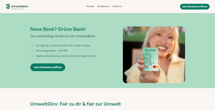 Die UmweltBank mit Sitz in Nürnberg realisiert seit fast 30 Jahren Projekte mit hohem Nachhaltigkeitsanspruch. Jetzt hat die UmweltBank ihr Angebot aus nachhaltigen Spar- und Wertpapierprodukten um ein grünes Girokonto erweitert. Mit dem UmweltGiro als nachhaltigem Alltagsbegleiter können Kunden ebenso nachhaltige Projekte unterstützen wie mit einem Tagesgeld- oder Festgeldkonto der nachhaltigen Direktbank. Denn die UmweltBank finanziert mit den Einlagen ihrer Kunden ausschließlich ökologische und soziale Projekte.